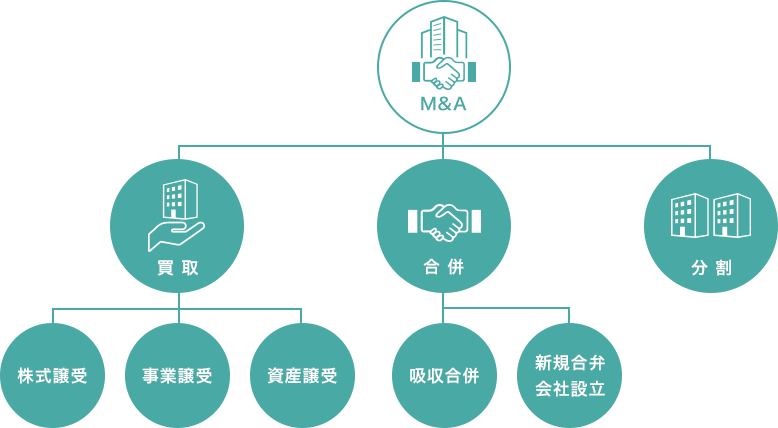 広義の意味では、資本提携・業務提携等も含まれます。”買収”(株式取得参加/事業譲受/資産譲受)、”合併”(吸収合併/新規合弁会社設⽴)、”分割” と様々な⼿法があり、⽬的に応じて最も適した⼿法を⽤います。